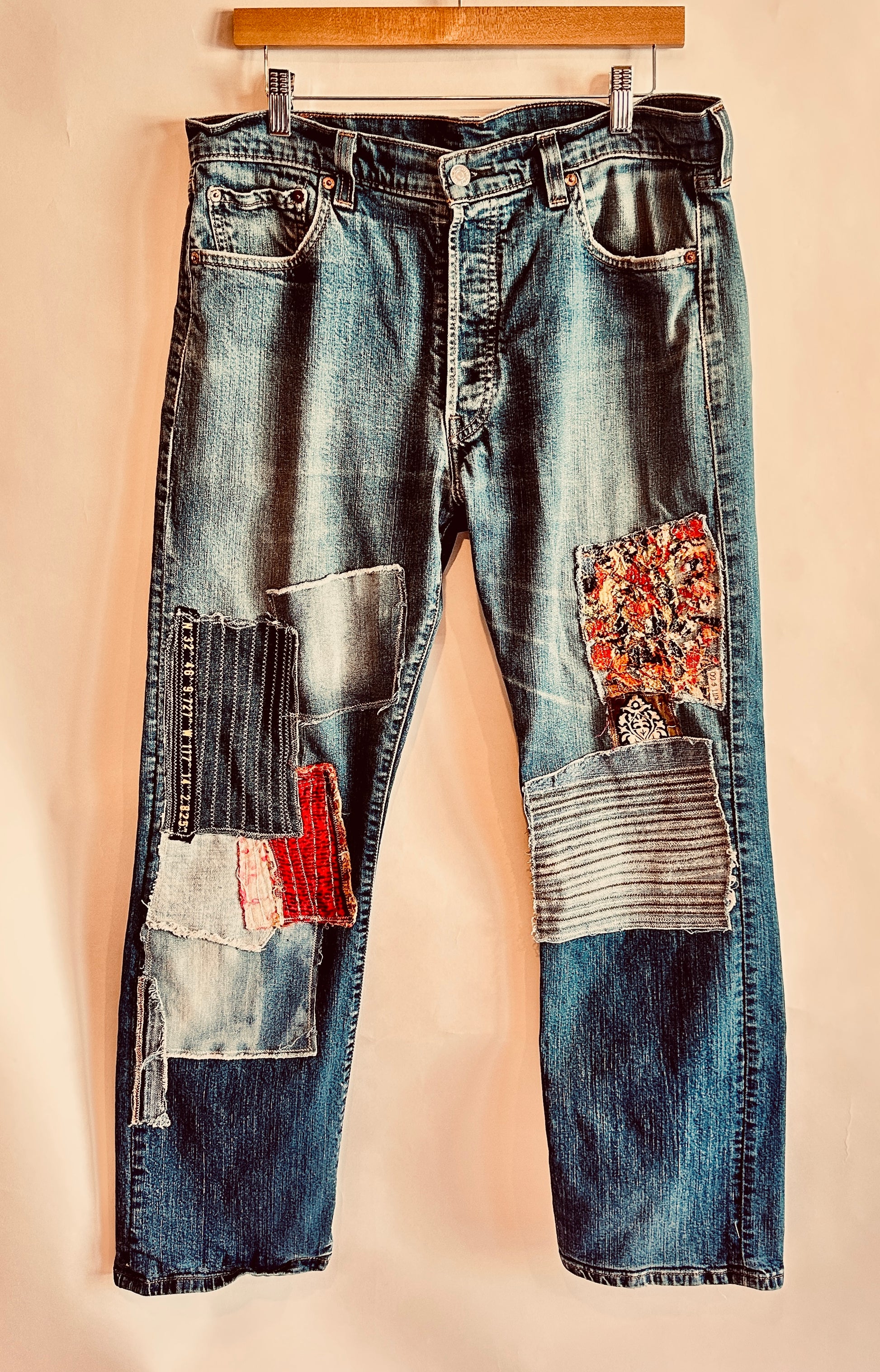 "DELILAH". Levi 501 Button-fly Jean with wear, hand-done patchwork throughout. Delilah is tough, soft around the edges and beautifully broken in.Every mend is intentional, every fade earned. A true one-of-one .