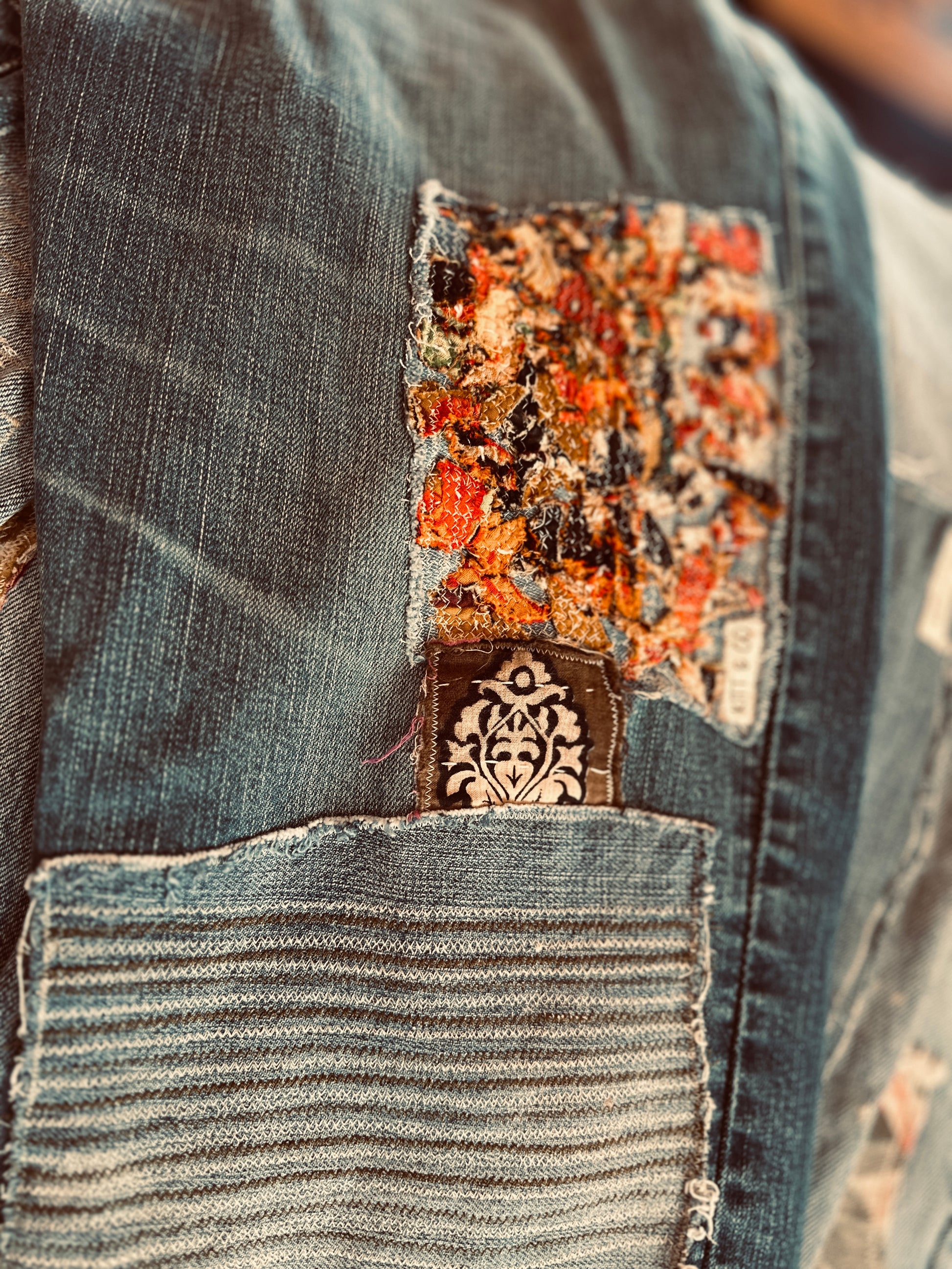 Small collection of handmade pieces from vintage denim. Thoughtfully selected fabrics and textiles. Perfectly distressed