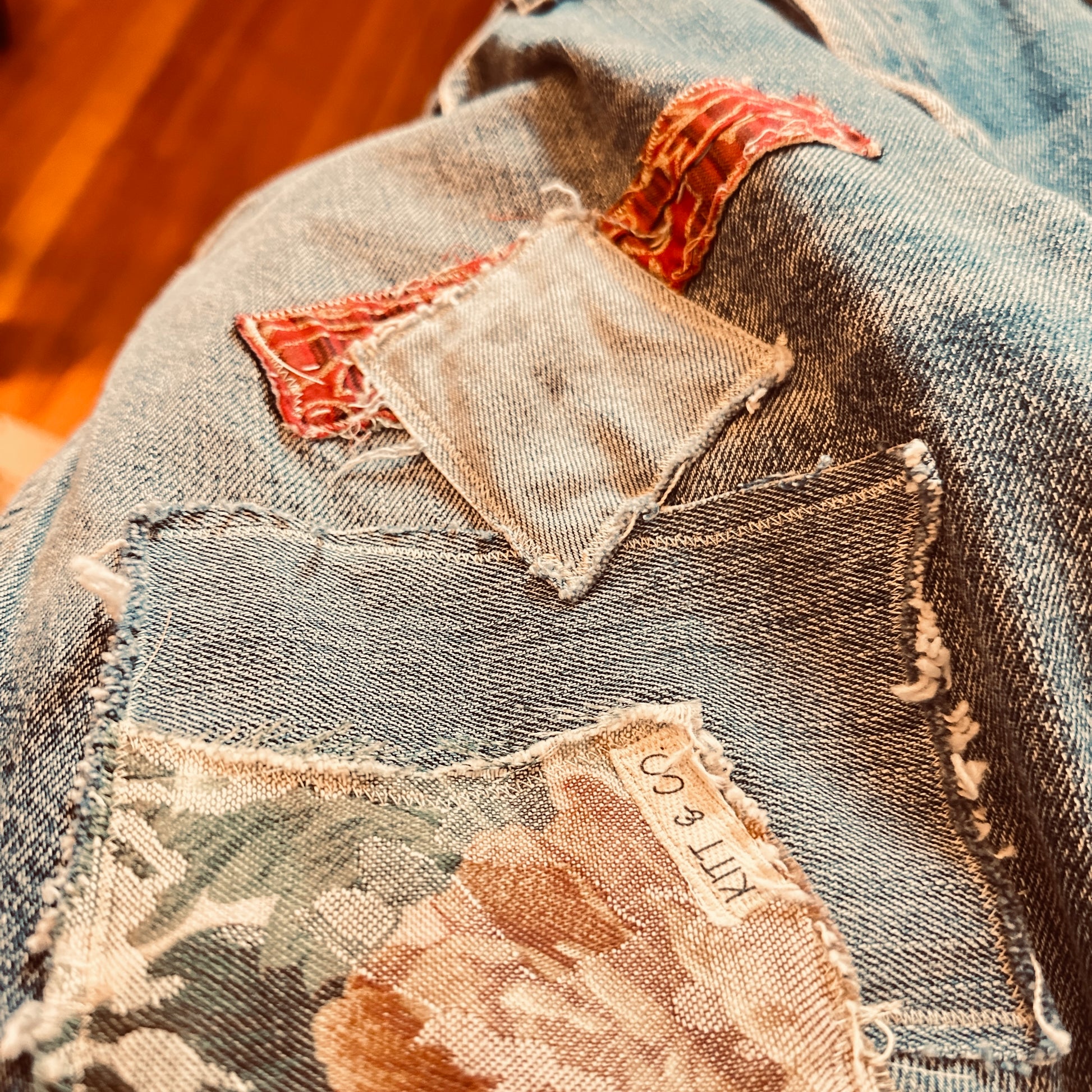 Small collection of handmade pieces from vintage denim. Thoughtfully selected fabrics and textiles. Perfectly distressed