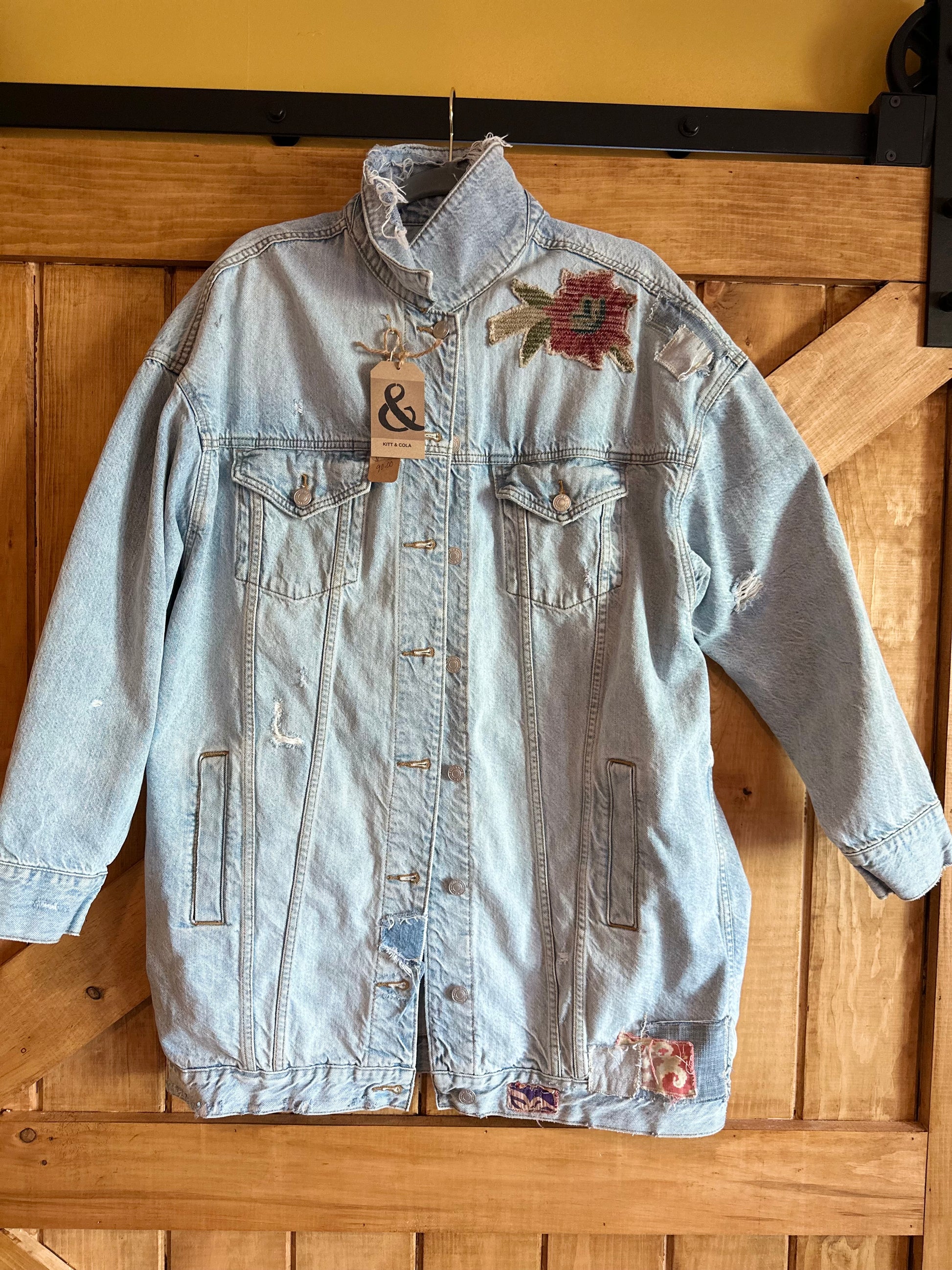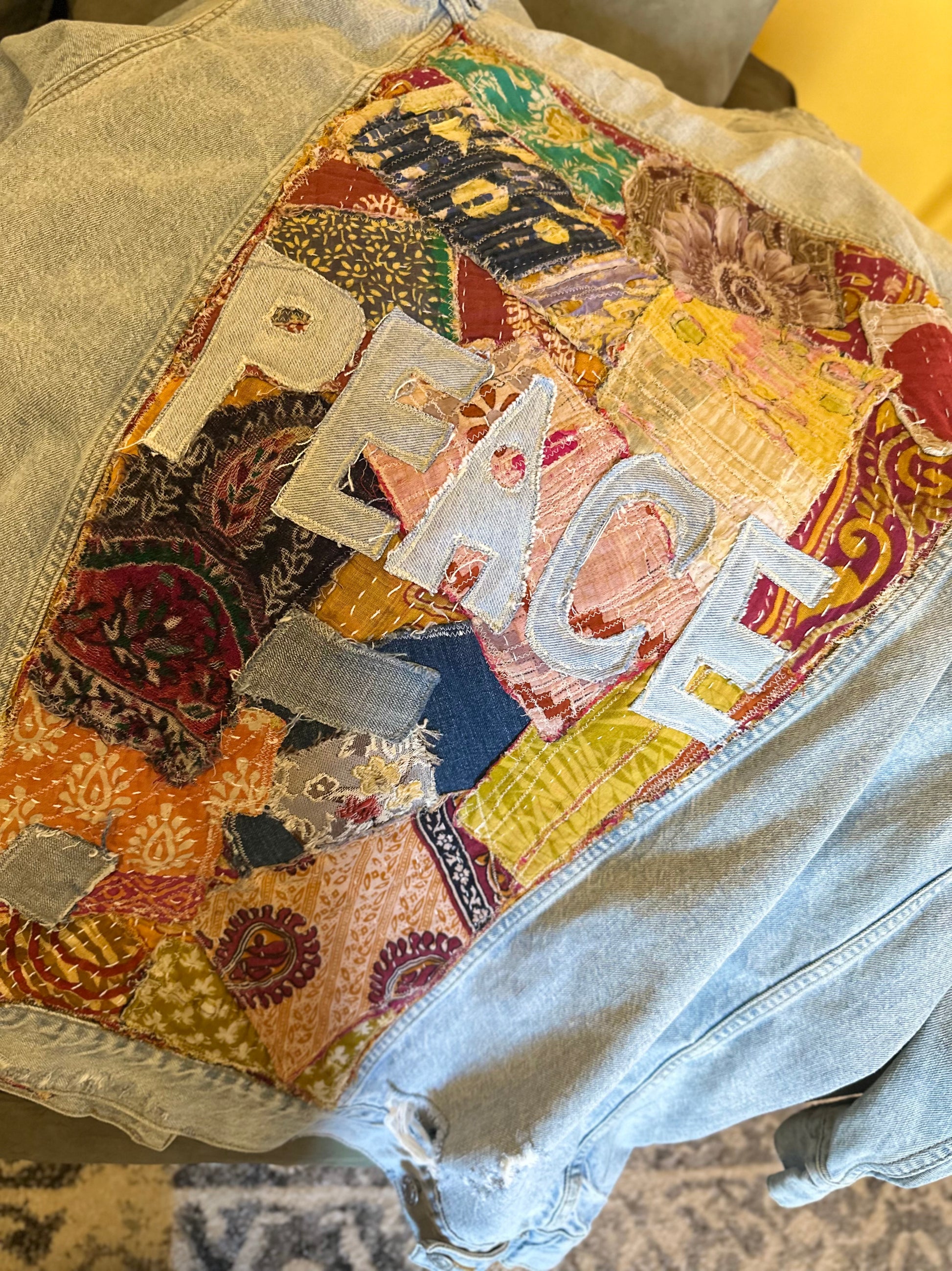 Statement oversized denim jacket with artful distressing, vibrant patchwork, and a bold "PEACE" declaration on the back- equal parts edgy and expressive. Machine wash and tumble dry.