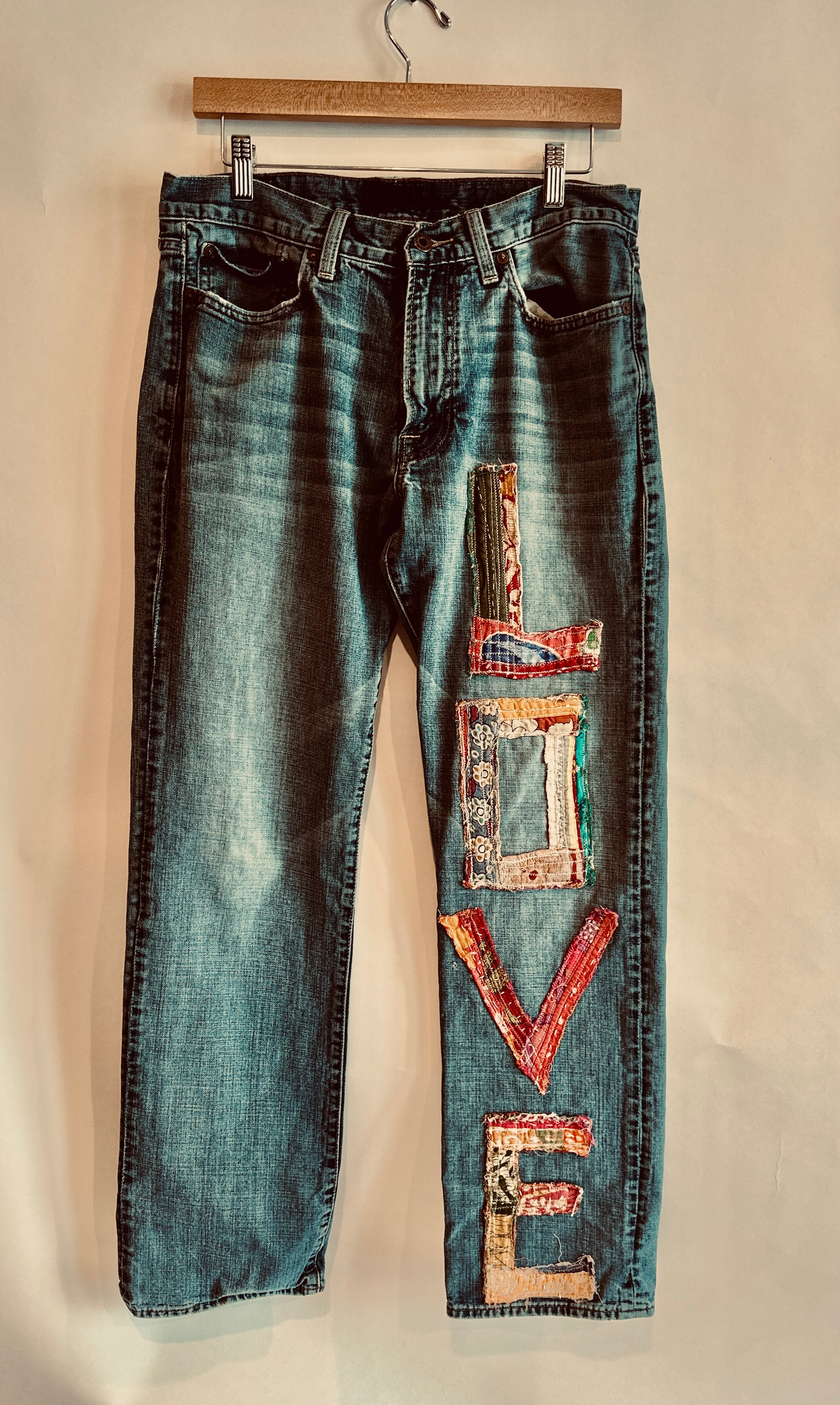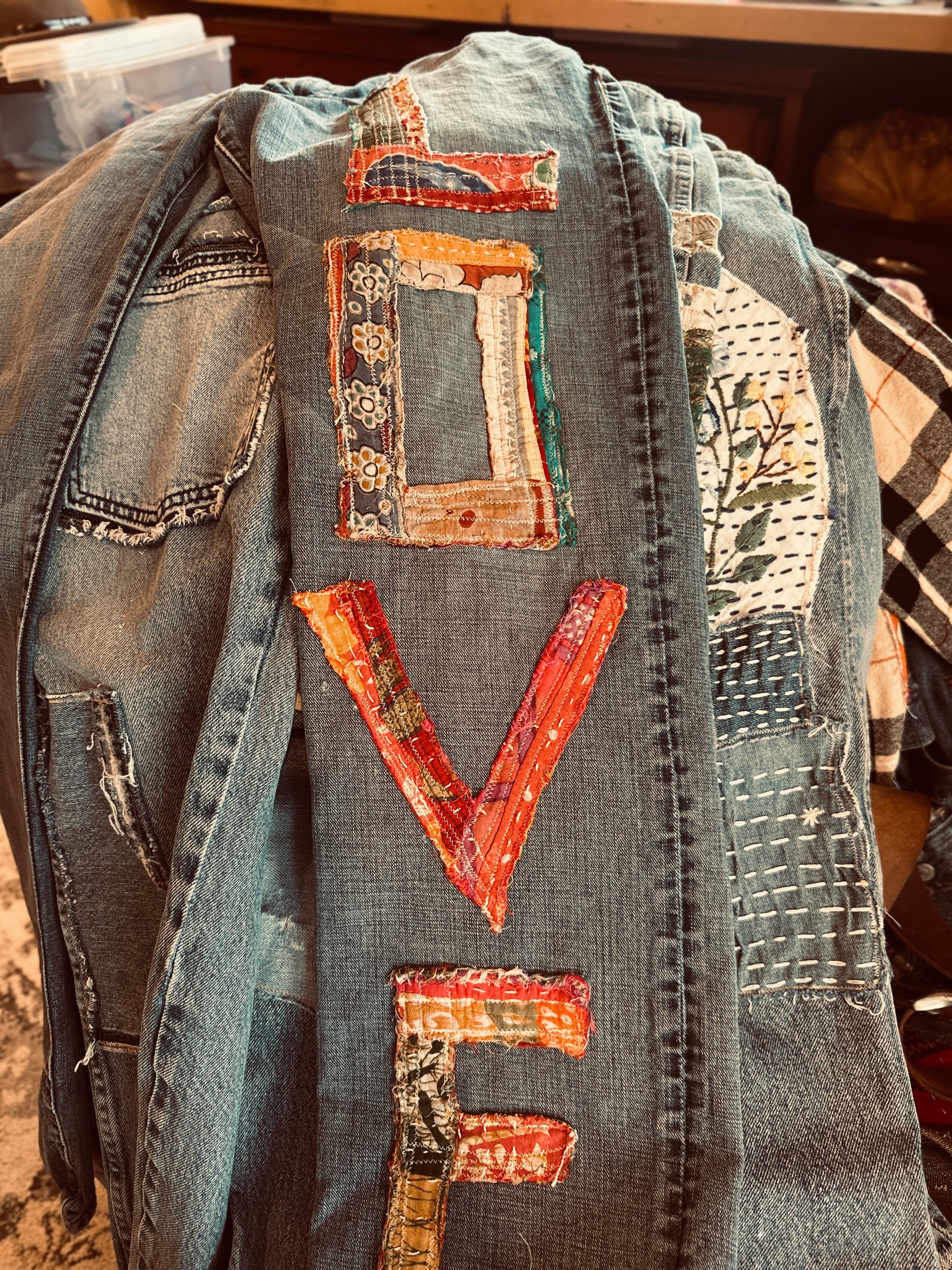 Small collection of handmade pieces from vintage denim. Thoughtfully selected fabrics and textiles. Perfectly distressed