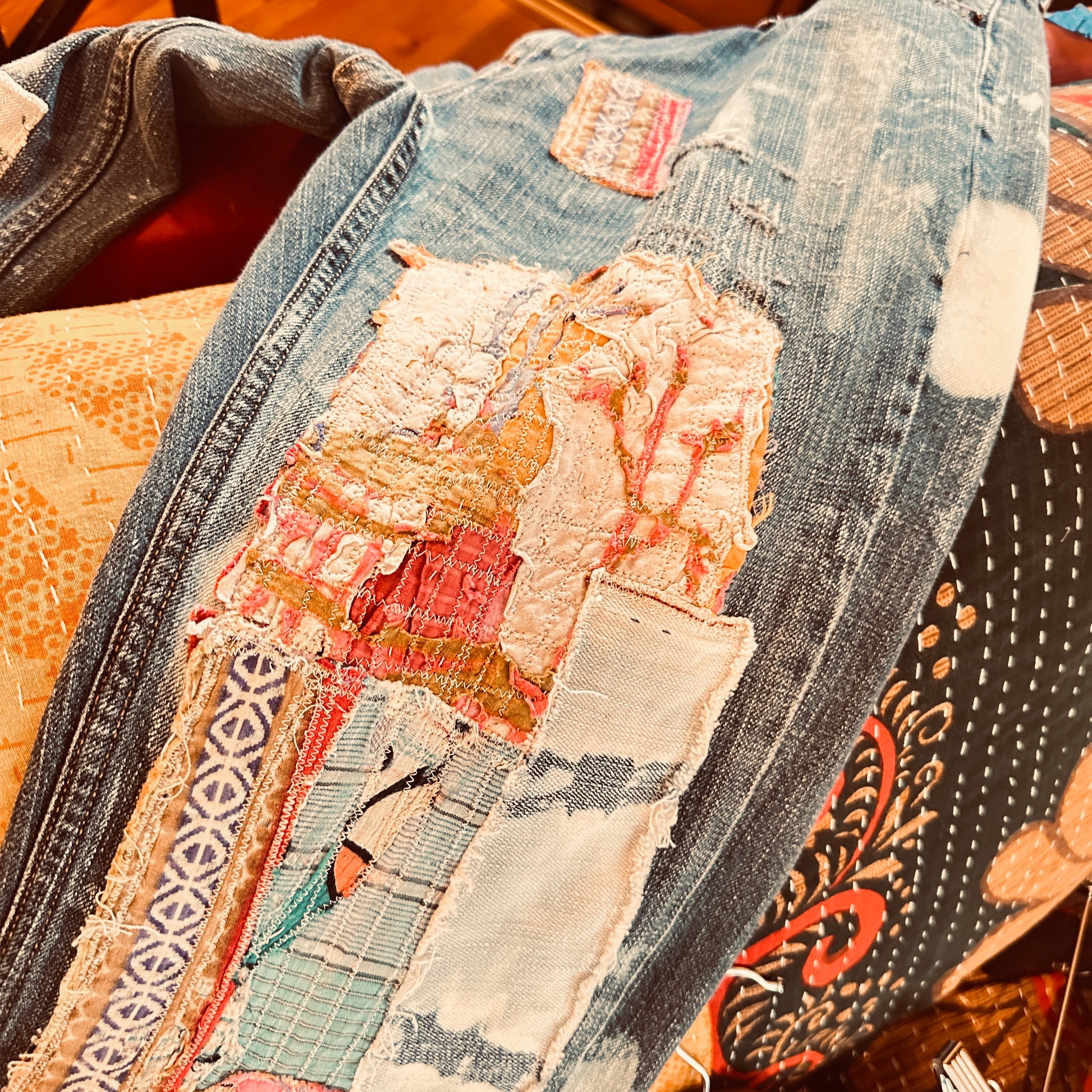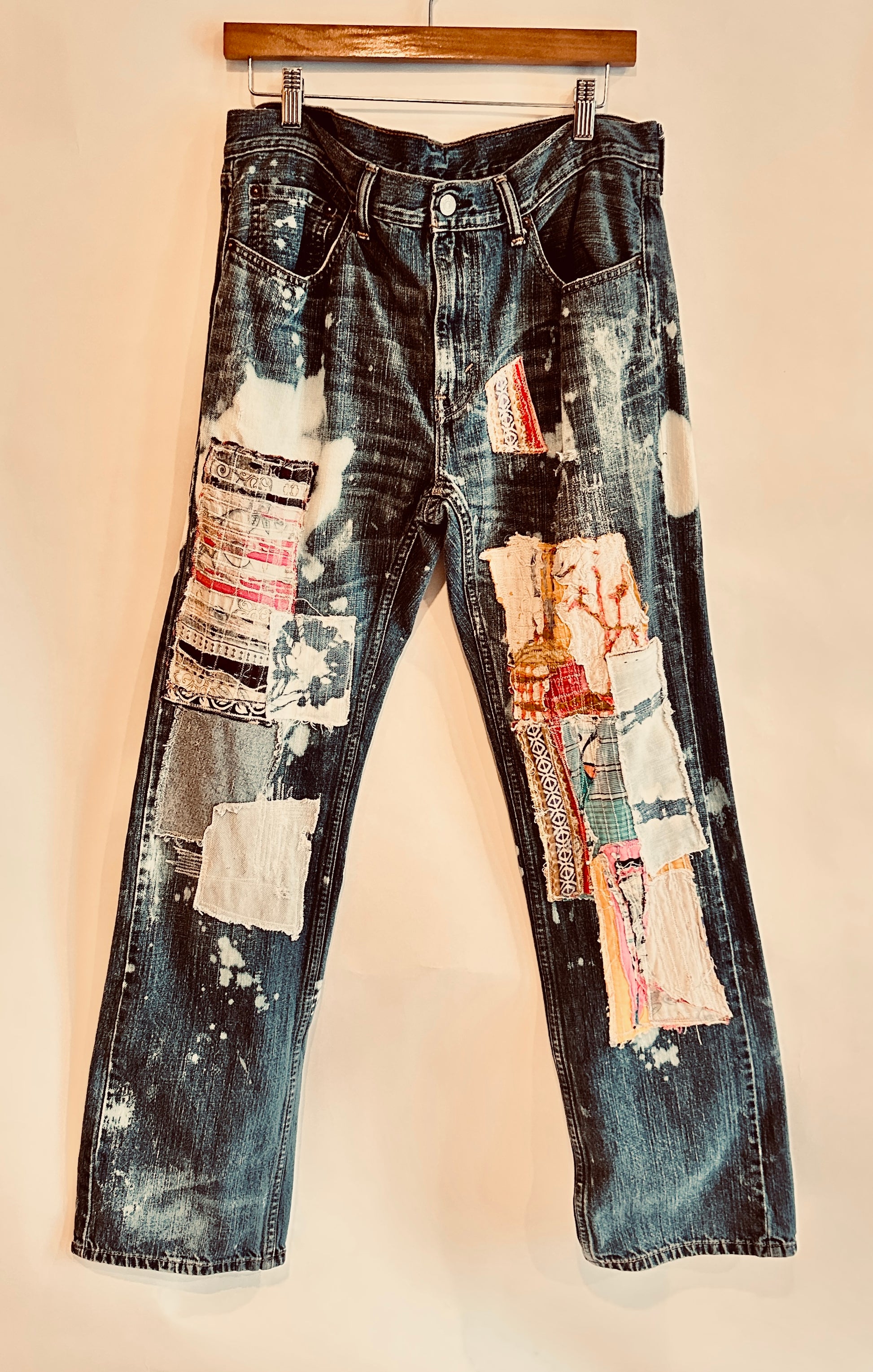 "LENNON" Levi Strauss vintage denim, perfectly distressed, visible bleach marks go perfectly with the patching and mending on this one. Lots of history in the fabrics used . Never repeated.