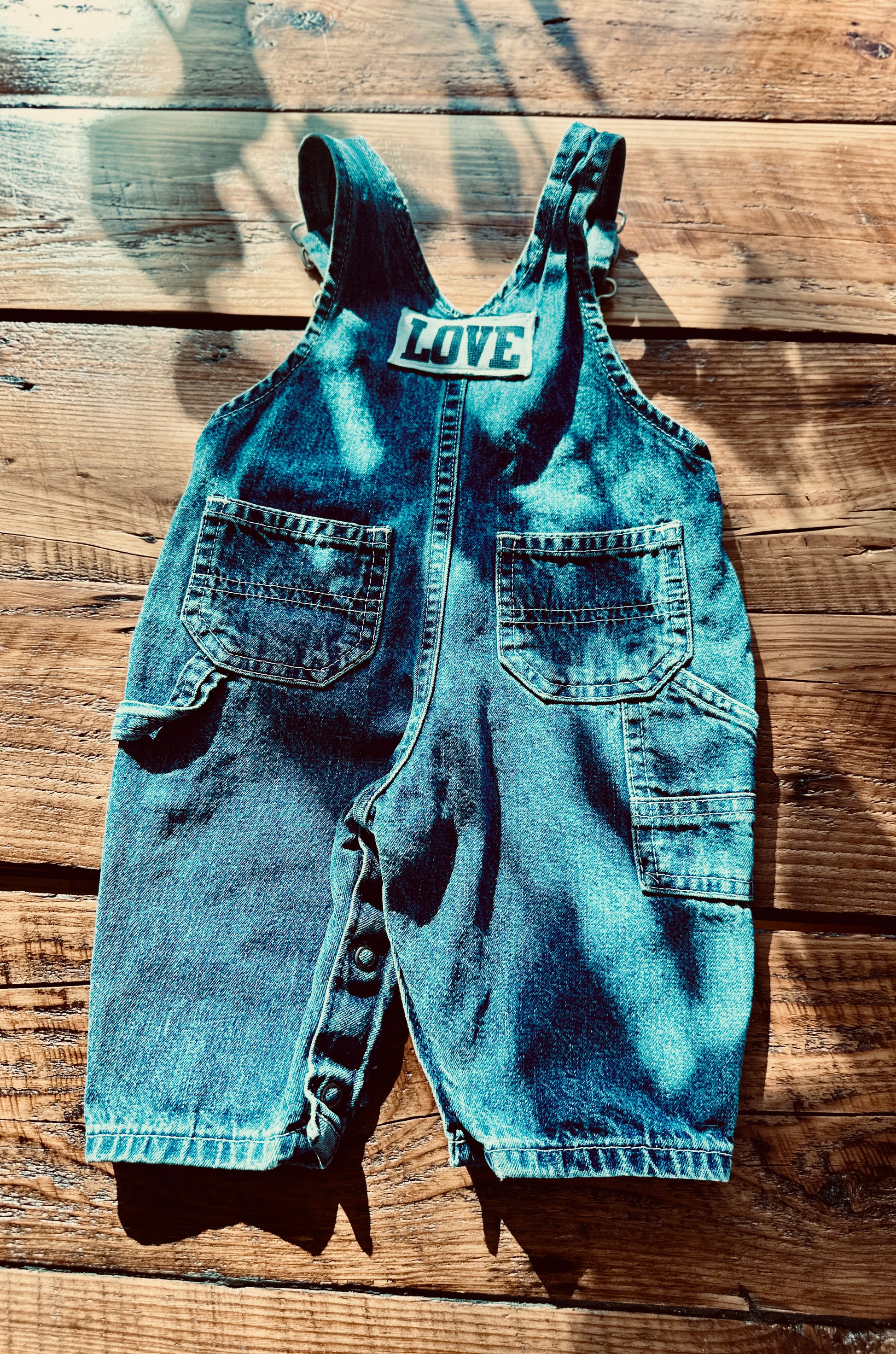 "LITTLE LOVEBUG" OshKosh overalls for the tiniest of explorers. Patched up ready to move. LOVE finds its way onto almost every little piece I create- this one included!