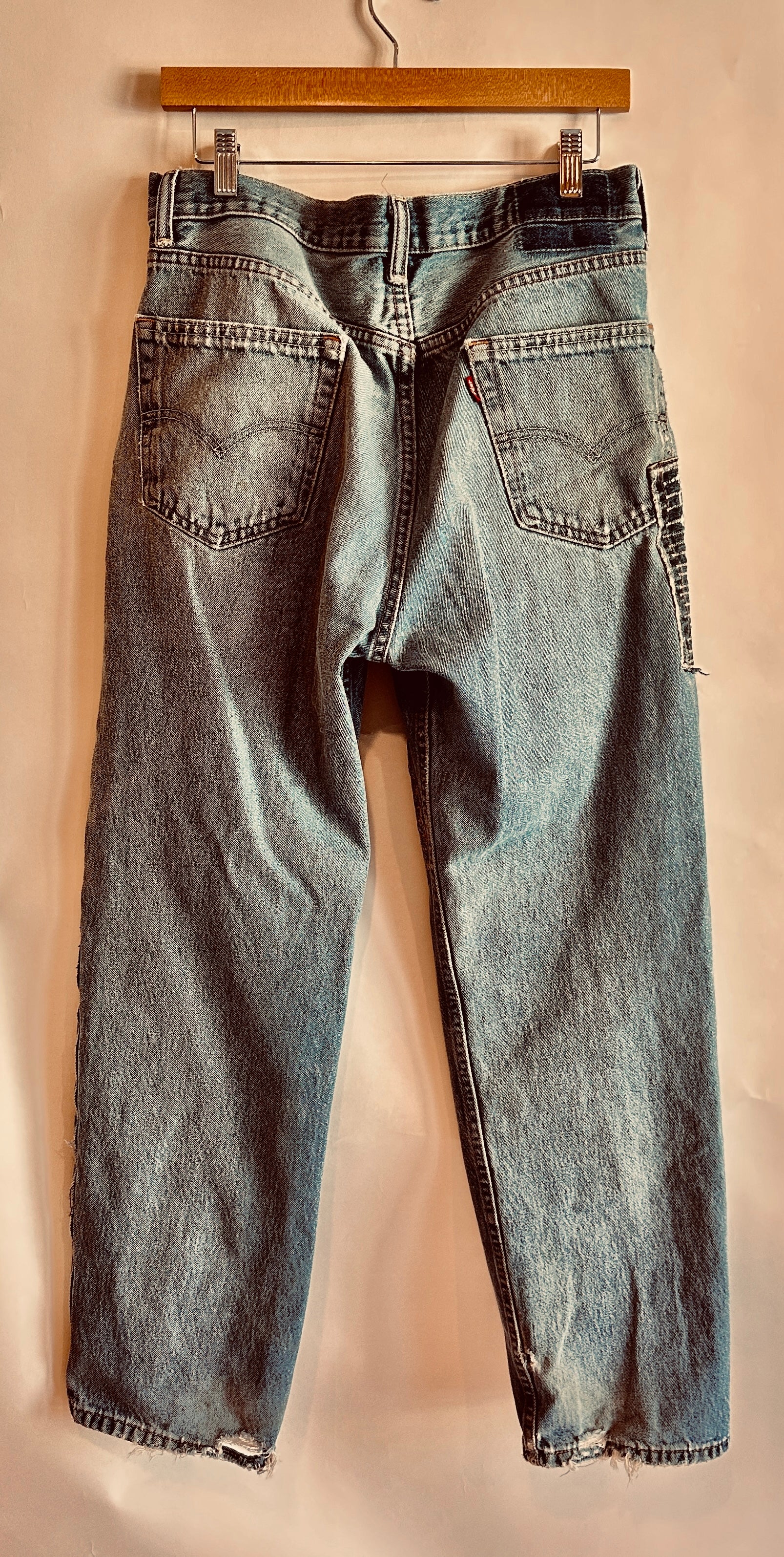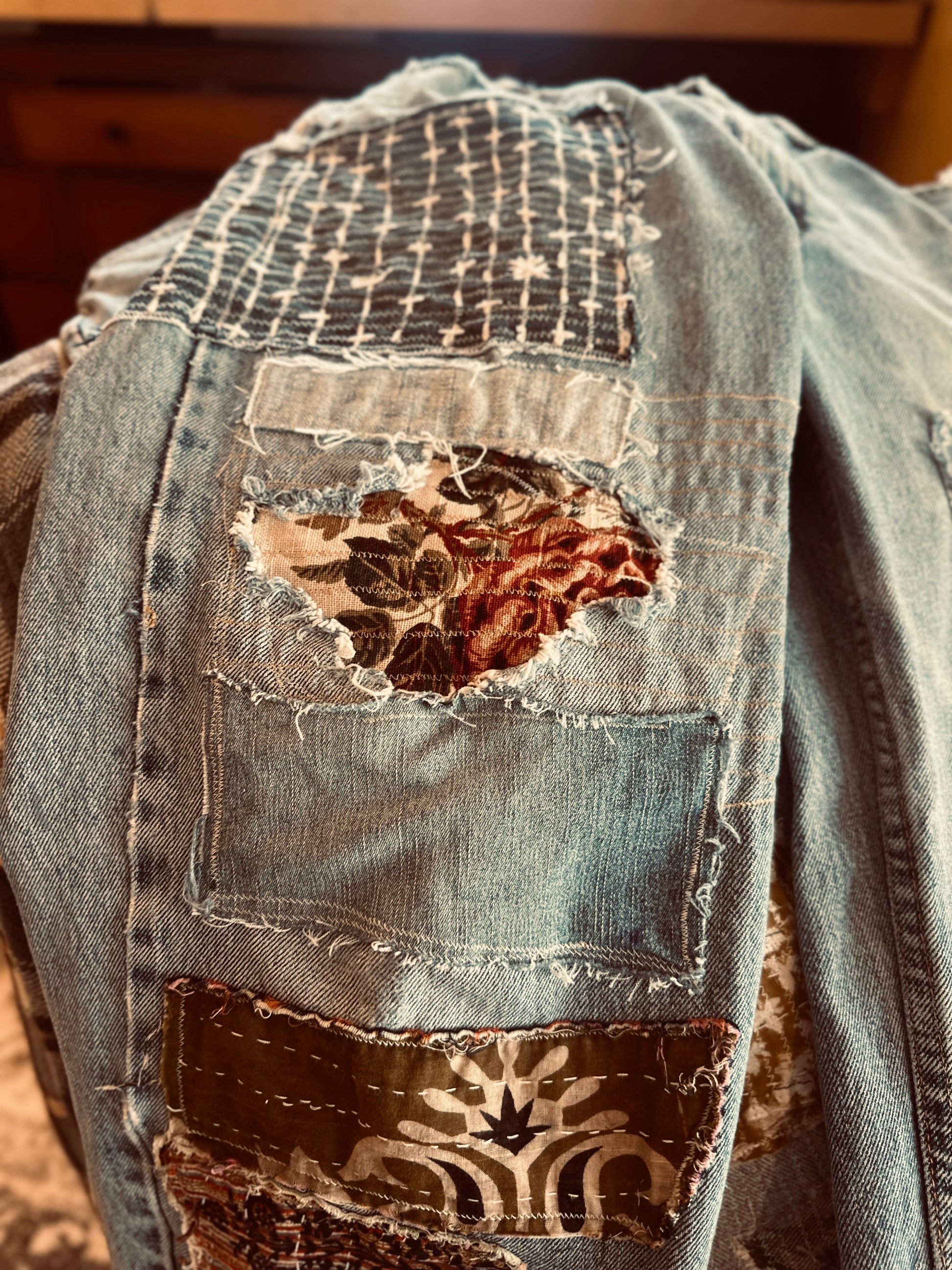 "SHINING SCAR". Perfectly faded Levi denim. Distressed through time and wear, reinforced by hand. Traditional Sashiko stitching meets raw patchwork- every repair visible, nothing hidden. Men's cut, relaxed and unapologetic.
