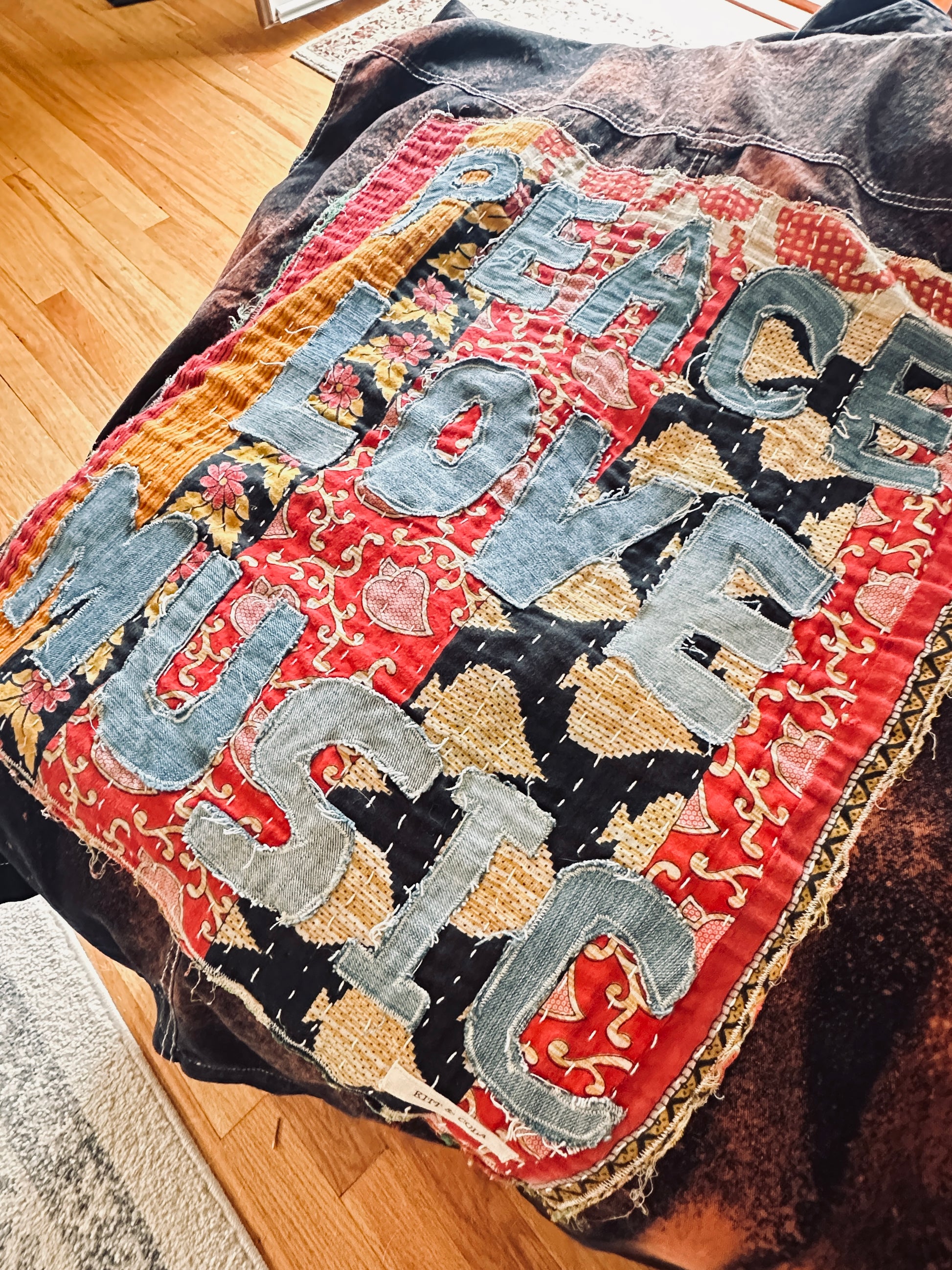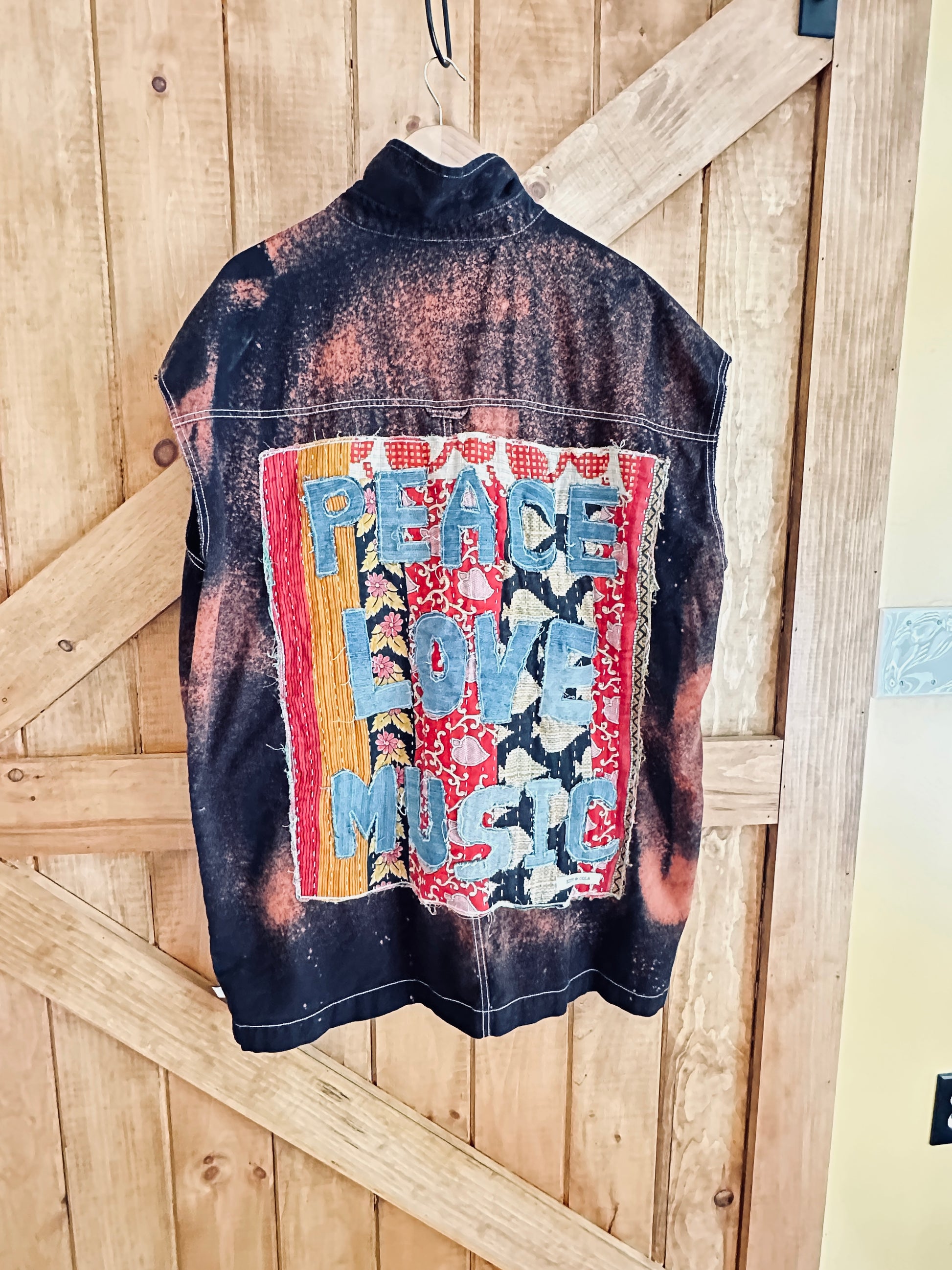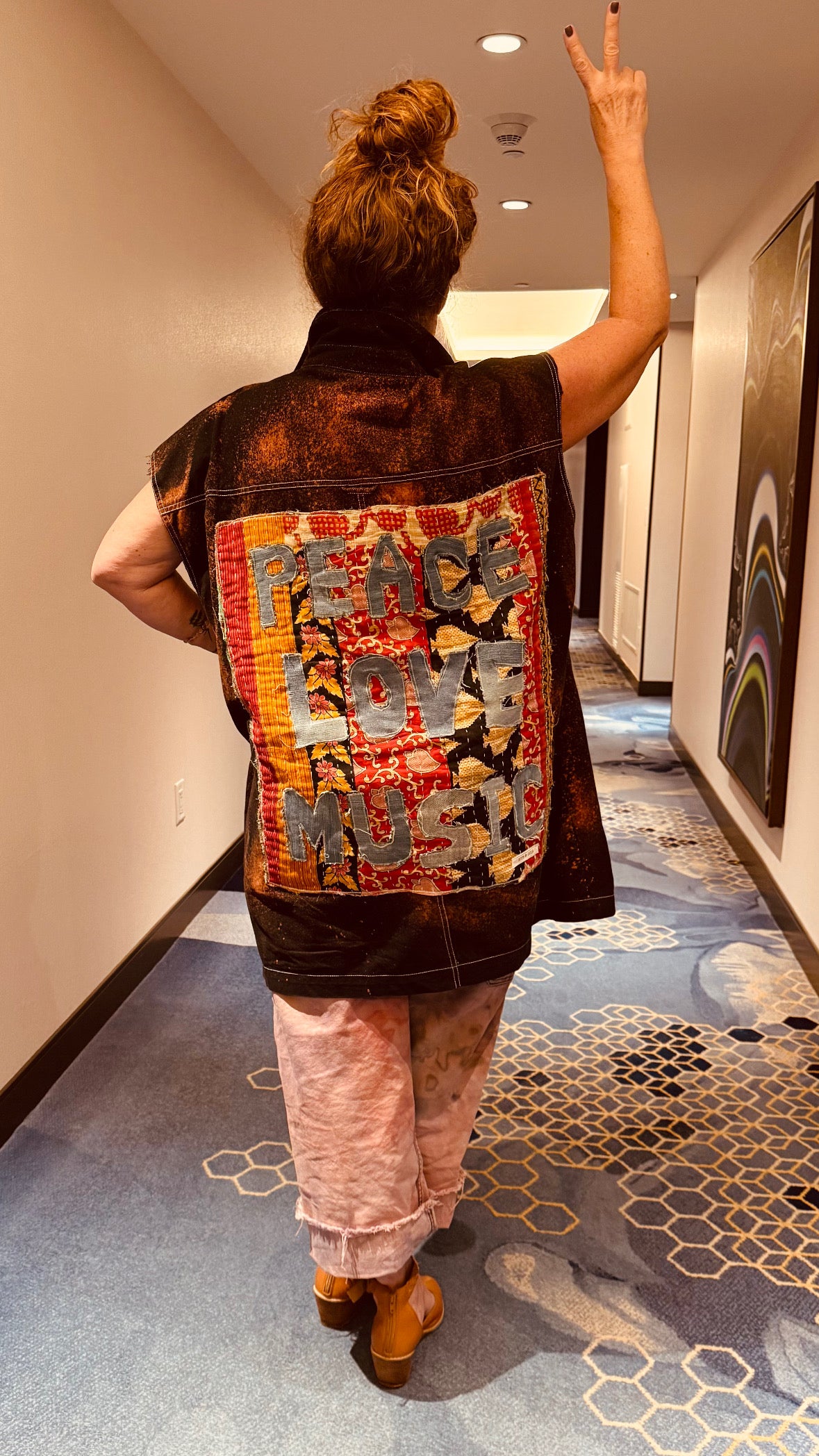 One-of-a-kind statement piece! Wear to your next Festival or concert. Handcut patchwork and distressed fabric detail. "PEACE, LOVE, MUSIC!